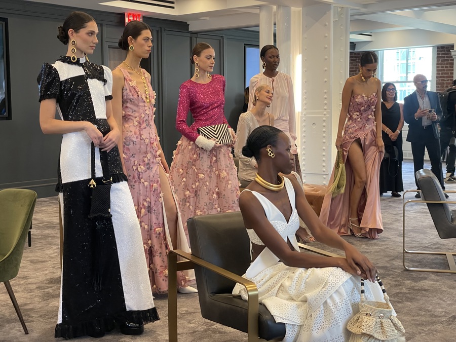 Mientras, entre las joyas que acompañaban las prendas de las maniquís brillaban dorados pendientes compuestos por varios aros y collares del mismo tono con detalles circulares, todos producidos en Colombia, indicó De la Cruz.