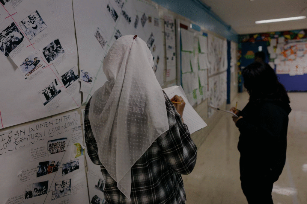 Estudiantes de una escuela secundaria de la ciudad de Nueva York para recién llegados trabajan en un ensayo de historia usando información de los pasillos. (José A. Alvarado Jr. para Chalkbeat)