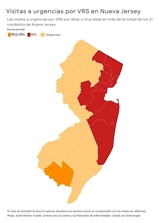 Los datos muestran que las visitas a urgencias y los ingresos hospitalarios por VRS han ido en aumento en Nueva Jersey desde principios de octubre. Actualmente, las visitas a urgencias por VRS son “altas” o “muy altas” en más de la mitad de los condados de Nueva Jersey.