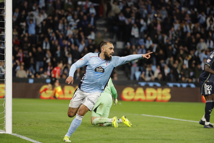 El delantero del Celta Borja Iglesias celebra su gol durante el partido de la jornada 27 de LaLiga que Celta de Vigo y Real Madrid disputan este viernes en el estadio de Balaídos, en Vigo. EFE/Lavandeira