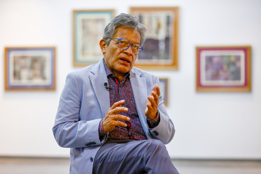 Con una paleta vibrante, marcada por azules intensos, naranjas encendidos y rojos profundos, el artista reconoce también como fuentes de inspiración a los textiles prehispánicos y a la exuberancia “de alto contraste” que lo circunda.