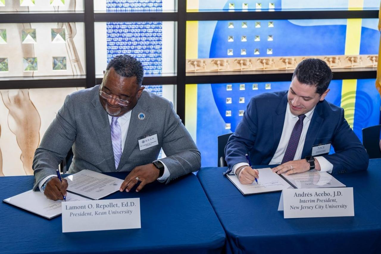 El presidente de Kean University, Lamont O. Repollet, a la izquierda, y el presidente de la New Jersey City University, Andrés Acebo, firman una carta de intención para promover una propuesta de fusión de ambas universidades en Kean University, en Union Township, Nueva Jersey. Foto cortesía de Kean University